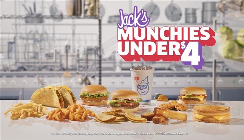 In response to rising inflation, Jack in the Box is rolling out a new value menu to give customers more bang for their buck. Starting June 3, 2024 the fast-food chain's "Jack’s Munchies Under $4 Menu" will feature a variety of fan-favorite items, including the Jr. Jumbo Jack, Two Tacos, French Toast Sticks, and more, all priced under $4.
